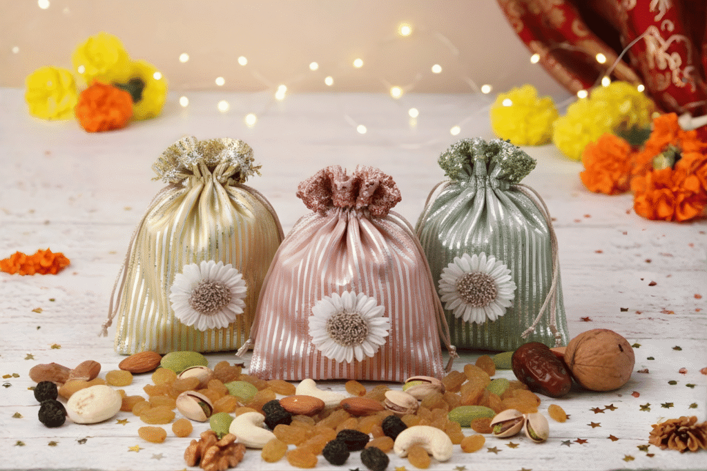 We curate an exquisite range of potlis crafted from rich fabrics — from organza and silks to velvets and jutes. An indispensable part of Indian weddings and celebrations, these potlis are perfect for presenting dry fruits or thoughtful little favours with timeless elegance.
