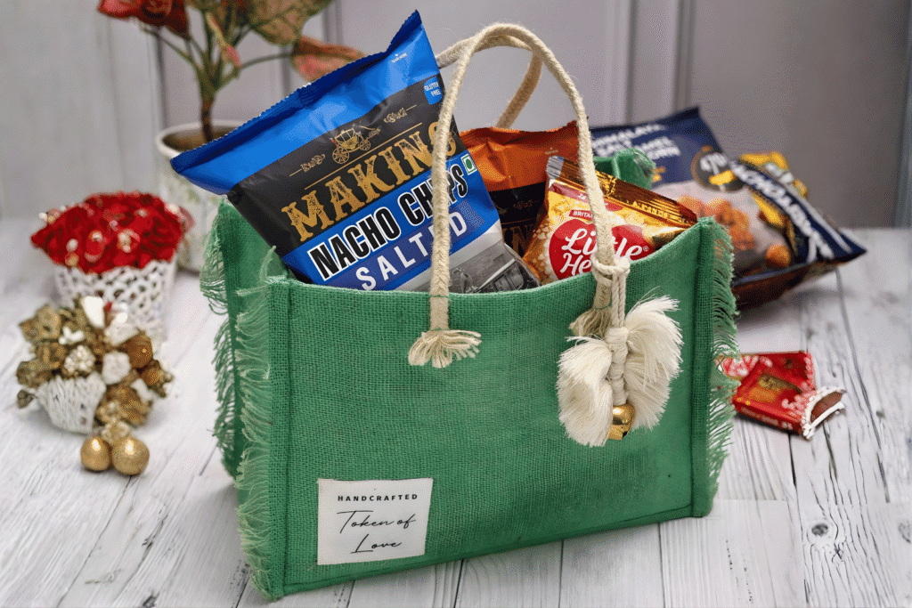 Exquisitely handcrafted in sustainable jute and canvas, our hampers blend elegance with practicality. Thoughtfully designed to be travel-friendly, foldable, and easy to carry back for guests, each piece is uniquely curated to reflect your celebration’s spirit and your personal aesthetic.